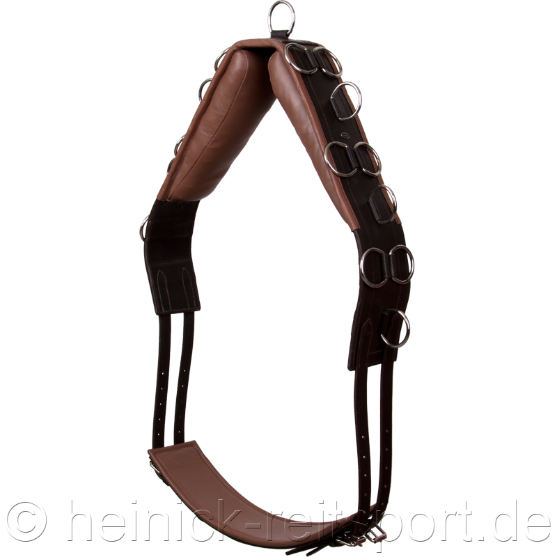 Der pferdefreundliche Heinick Qualitäts Longiergurt ermöglicht einen professionellen Einsatz beim Longieren. Dieser Longiergurt hat 20 Ringe, die ein ideales Arbeiten, auch mit Doppellonge und Hilfszügeln ermöglichen. Zusätzlich hat dieser Longiergurt weiche Kissen mit Wollfüllung, um dem Nussknackerefekt auf dem empfindlichen Pferderücken entgegenzuwirken. Auch die breite Auflagefläche am Widderrist gewährt eine verbesserte Druckverteilung und schützt die Dornfortsatzenden des Pferdes. Dieser Heinick Longiergurt ist beidseitig verschnallbar und hat zusätzlich einen weich gepolsterten Bauchgurt mit Ring. Dieser hochwertige Longiergurt ist aus bestem Leder gefertigt und mit Edelstahlbeschlägen versehen. Der Heinick Qualitäts Longiergurt ist in den Farben Schwarz, Braun-Chesnut und Schwarz-Tan, sowie einer Einheitsgröße für Warmblut = Full und Vollblut = Cob erhältlich.